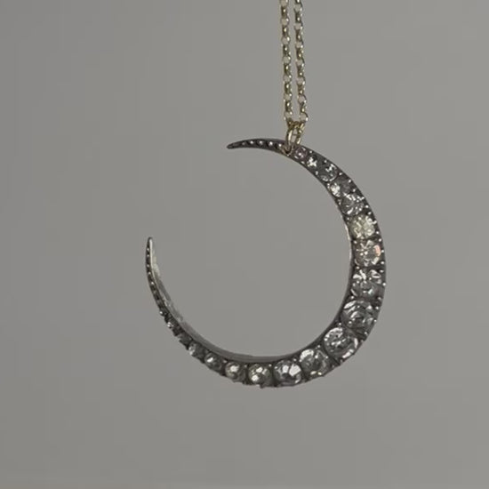 Charming Edwardian crescent Moon (former brooch) made from sparkling paste stones set on sterling silver is converted into a beautiful necklace paired with a 9ct gold trace chain.